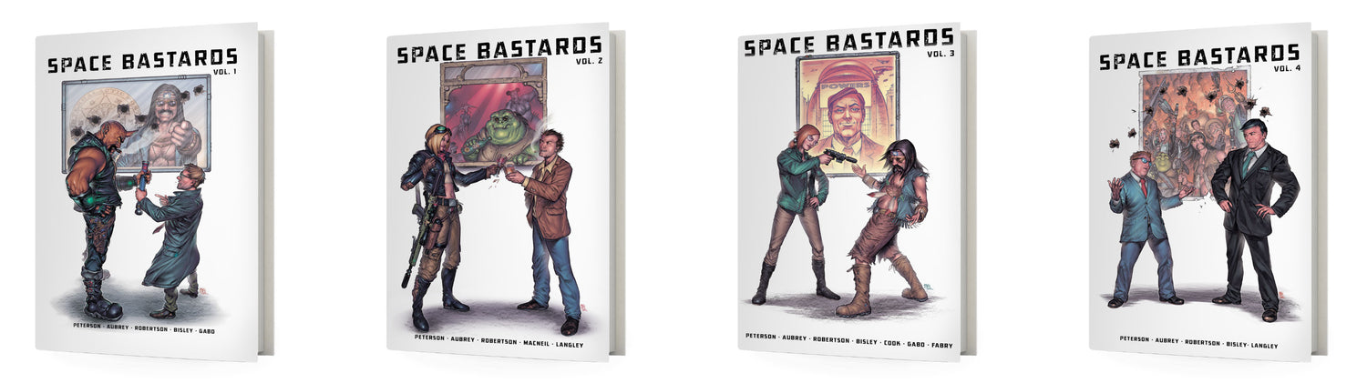 All four volumes of the first year of SPACE BASTARDS make a gorgeous display for your library. Got volume 1 and need the rest?